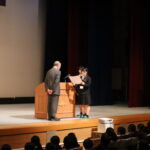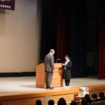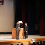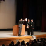 次に生徒会任命式が行われ、新しい生徒会役員の発表と新生徒会長の挨拶がありました。また、新旧の生徒会