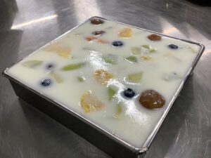 ⑤流し缶に果物と、寒天を入れ冷やす。