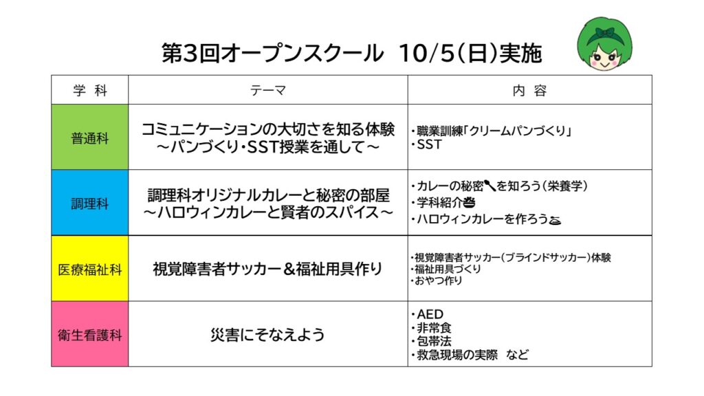 第3回オープンスクールは、午前中のみの体験です。4つの学科から1つの学科を選択していただきます。