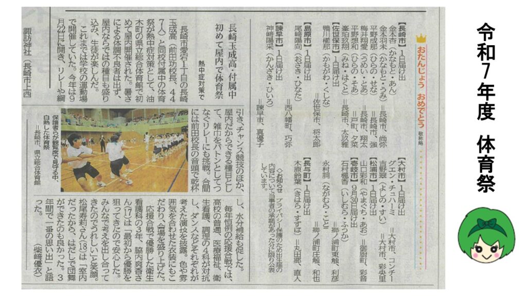 全校医療福祉科普通科衛生看護科調理科2025.10.08 【高校】体育祭について(長崎新聞掲載) 9月22日(月)におこないました体育祭の様子を、取材していただきました。 今年度は、熱中症予防の観点から長崎県立総合体育館(アリーナかぶとがに)での開催としました。 NHKさんとNCCさんにもそれぞれ取材をしていただきました。 下記リンクから視聴することが可能です。どうぞご覧ください。 NCC(ニュース)← クリック 長崎新聞(体育祭)← クリック