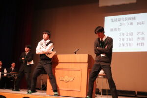 皆緊張した様子で、立候補した動機や公約、生徒会長や副会長になって、こういった活動をしていきたい