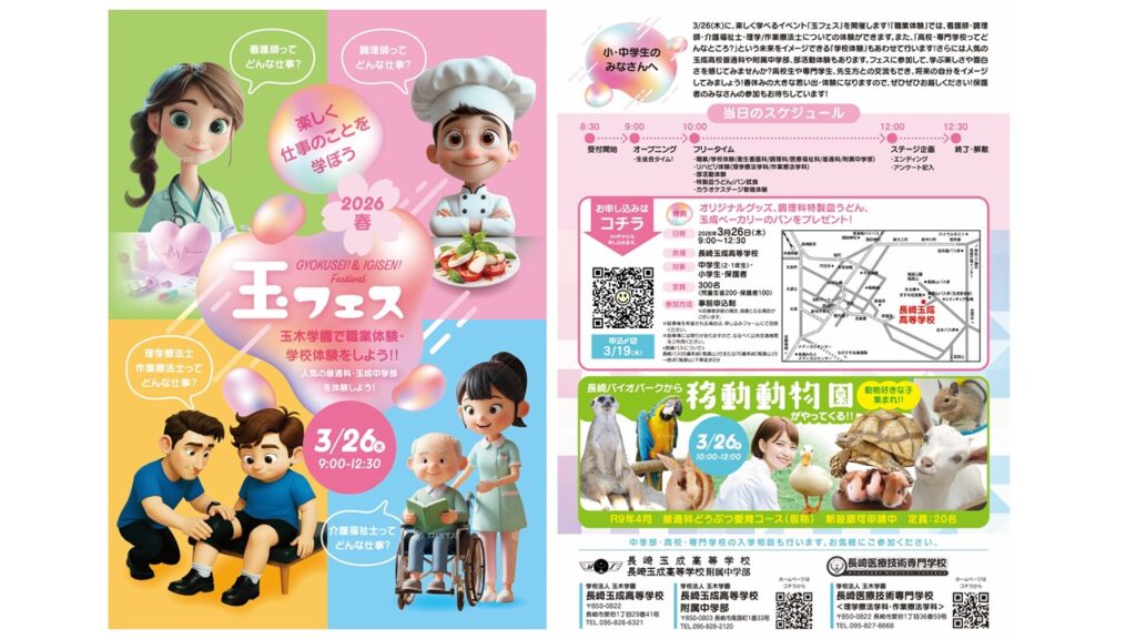 3月26日(木)に、玉フェスを今年も開催します。『職業体験』では、看護師・調理師・介護福祉士・