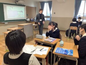 授業開始。ハリー先生と英語の授業です。英語で会話するのは緊張しますが、笑顔で優しく教えてくれます。