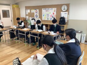 附属中学部の1日は、8時30分から始まる10分間のみん読(読書)から始まります。その後は朝礼を行い、