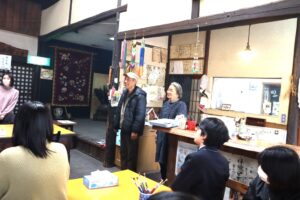 最初はキヤノン工場です。みんな真剣に聞いています。絵付け体験では、暖炉があり、風情ある場所でした。
