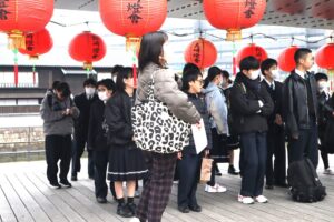 行先は波佐見町、キヤノン工場と波佐見焼の絵付け体験です。集合は出島表門橋、ランタンフェスティバル